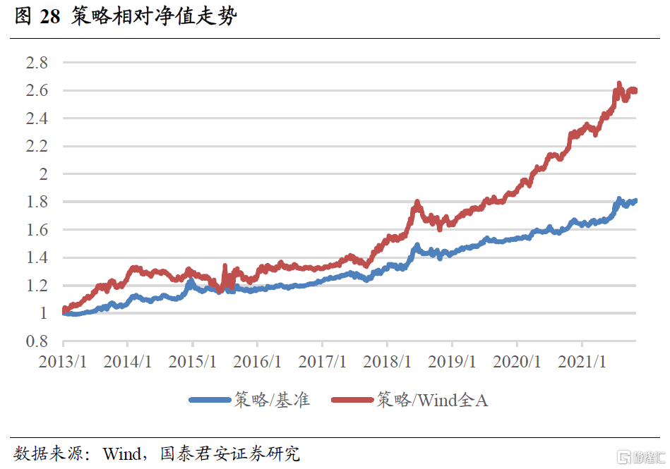 策略持续跑赢基准及Wind全A指数,具有显著超额收益。根据上文中的设置,策略持续跑赢等权基准及Wind全A指数,最近1个月小幅跑赢,相对等权基准及Wind全A的超额收益分别为0.6%和0.4%。
