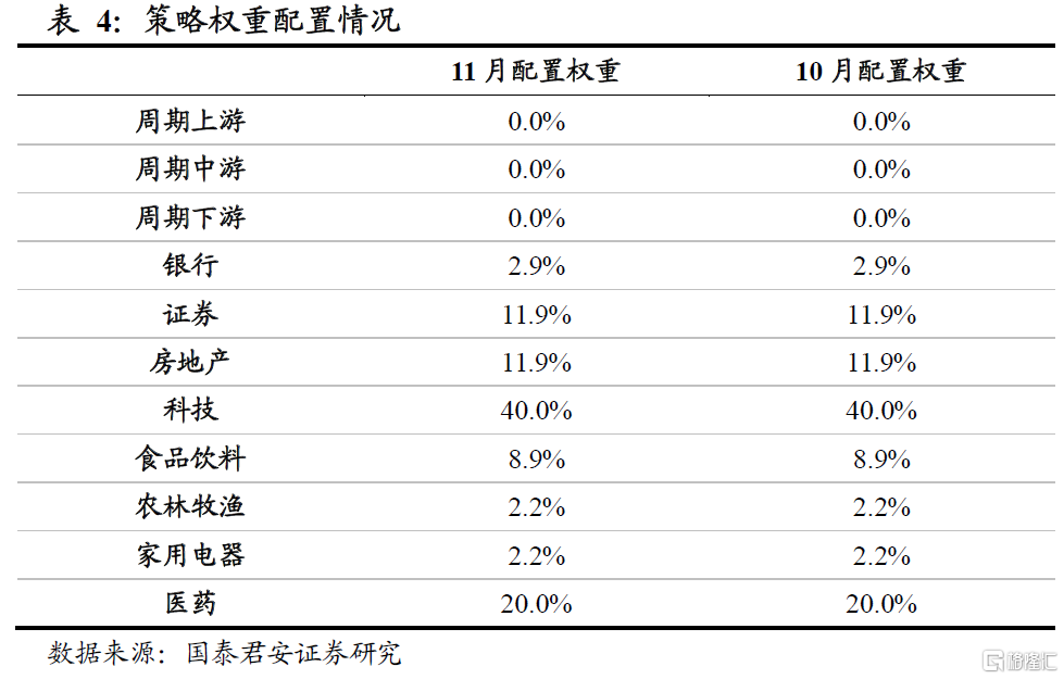 我们对11月份各行业的景气度判断与10月一致,依据模型,最新行业配置权重建议如下表所示。