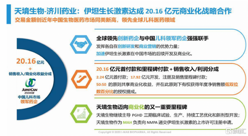 11月10日,天境生物与济川药业举行战略合作签约仪式,就前者的伊坦生长激素(TJ101)达成产品开发、生产及商业化战略合作。据报道,此项合作总金额高达20.16亿人民币,交易金额创下了近年中国生物医药市场及全球儿科医药领域同类新高。