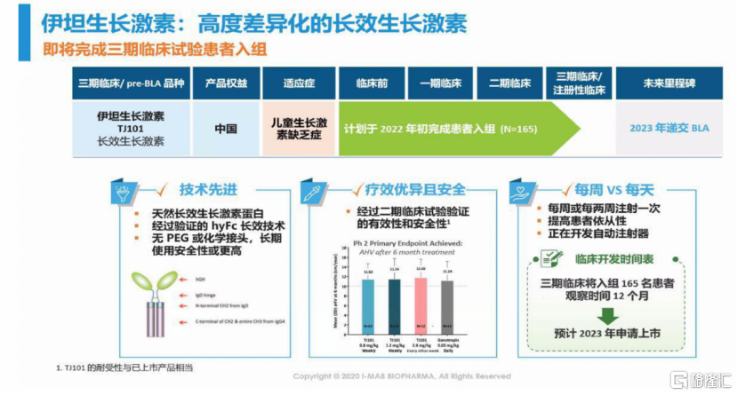 简单介绍一下伊坦,天境生物的伊坦生长激素是基于创新型杂合Fc融合蛋白技术开发的一种高度差异化、长效重组人生长激素,具有全新的分子形式。据介绍,该药拥有较长的半衰期,能够延长给药间隔,为患者带来更好的治疗体验和效果。而且,与聚乙二醇化rhGH(重组人生长激素)药物相比,伊坦生长激素在长期安全性方面也具有潜在优势。
