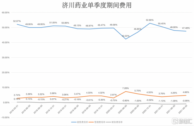 从数据角度来看,当前济川药业的销售费用一直保持在50%左右的水平,透过销售费用率不难看出济川药业对于销售方面的投入绝不手软。