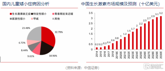 首先我国生长激素产品面临蓝海市场,巨大临床需求尚未满足。我国儿童患矮小症的比例约为3%。矮小症病因多样,其中生长激素缺乏症最为常见,占比约三分之一,而生长激素为目前针对矮小症的唯一有效药物。然而,目前只有3.7%患有生长激素缺乏症的儿童接受生长激素治疗,庞大的市场空间尚未拓展。根据Frost&Sullivan预测,随着生长激素在矮小症患者儿童渗透率的提升,预计2030年中国生长激素市场规模可达到32亿美元。