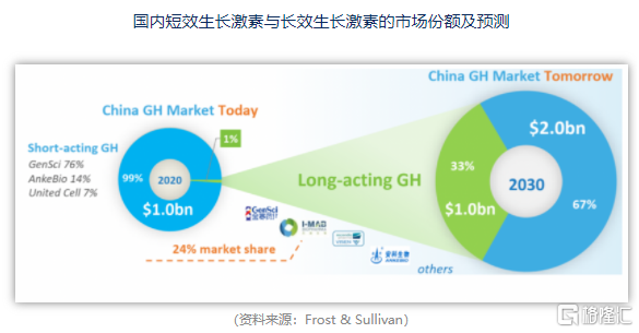 其次生长激素产品亟待升级,长效生长激素潜力巨大。目前,国内市售的生长激素绝大多数为每日均需注射的短效生长激素,高频率的注射使很多矮小患者难以坚持治疗,用药依从性较差,自行注射的短效生长激素也带来较高的断针风险和安全性隐患。长效生长激素于2014年上市,每周注射一次即可;目前国内市售的长效生长激素为聚乙二醇化生长激素,其在安全有效的基础上极大提高了患者的依从性。长效生长激素目前在国内市占率仅为1%左右,具有极大潜力,据Frost&Sullivan测算,长效生长激素市场份额有望在2030年增长至生长激素市场的三分之一。