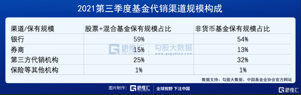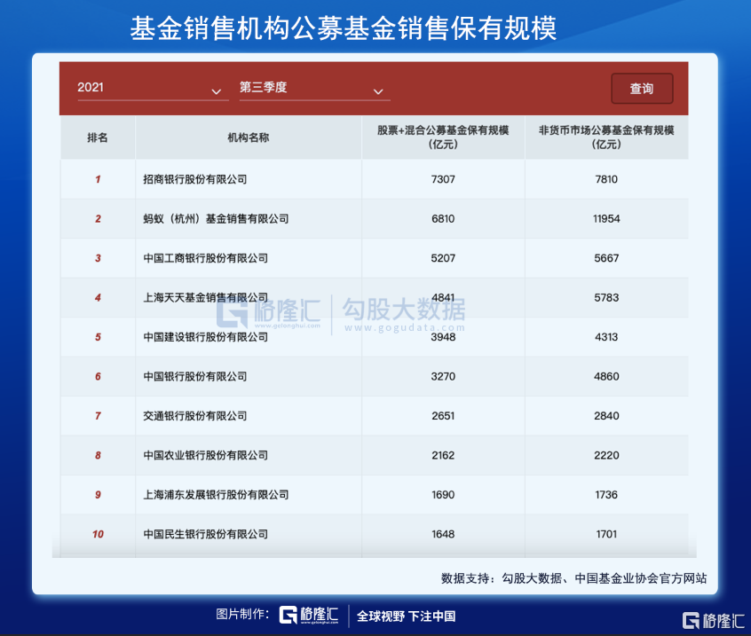 该榜单显示,截至2021年第三季度末,按照股票+混合公募基金保有量和非货币公募基金保有量进行排名,跻身前10的代销机构分别为招商银行、蚂蚁基金、工商银行、天天基金、建设银行、中国银行、交通银行、农业银行、浦发银行及民生银行,除了交行与农行互换位置外,其余机构排位与上一季度并无变化。