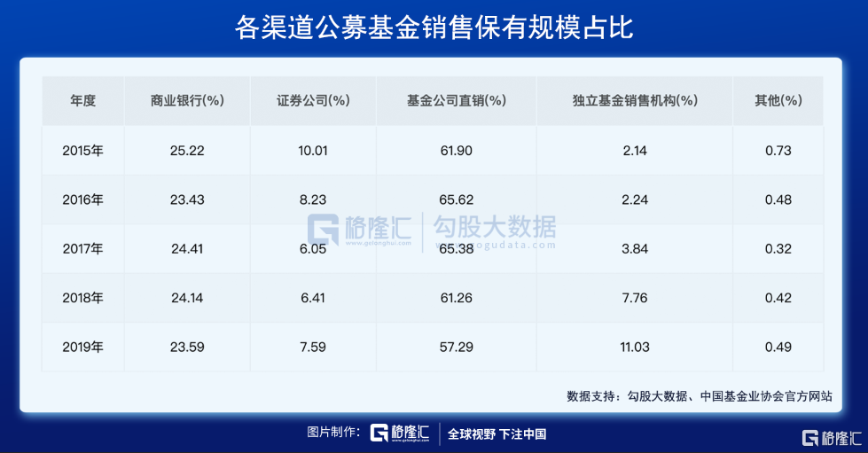 近年来崛起的第三方代销平台,似乎是整个公募基金代销增长的“生力军”。2015-2019年,其从2.14%的保有量市场占有率大幅提升至11.03%,一举超越了券商渠道,成为排在银行渠道之后的基金销售渠道。