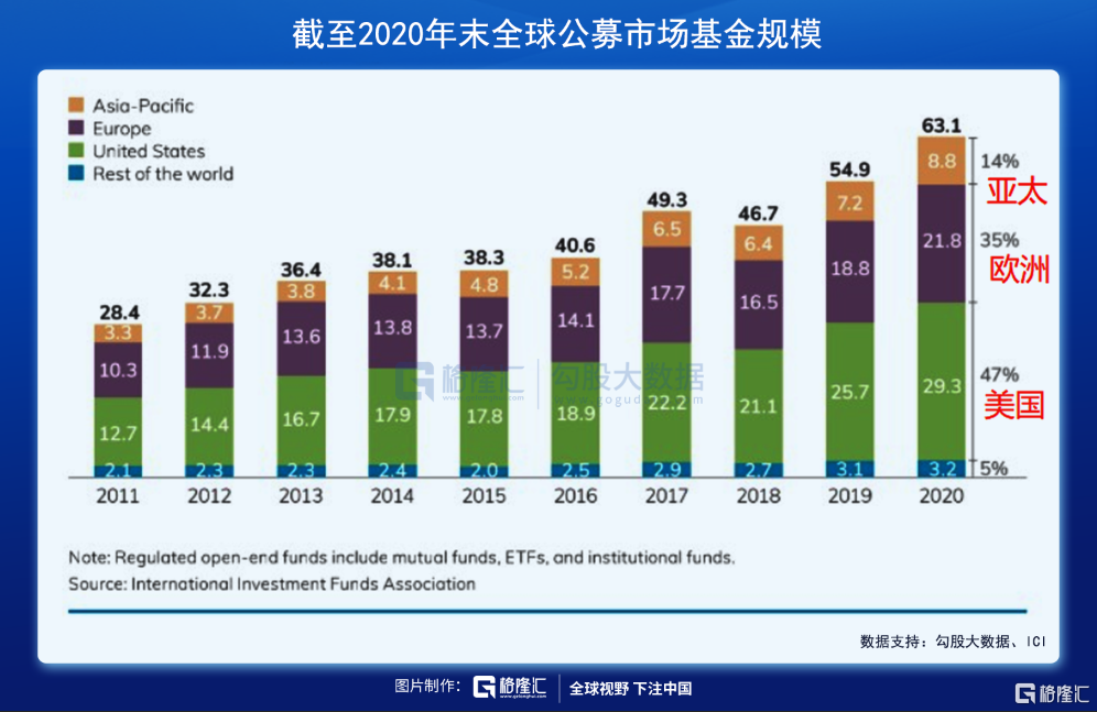 投资公司协会(ICI)发布的《2021美国基金业年鉴》显示,截至2020年末,全球公募市场基金规模增至63.1万亿美元,其中美国市场和欧洲市场分别以47%(29万亿美元)和35%(22万亿美元)领先,分别排在第一、第二位。对比之下,包括了中国市场在内的整个亚太地区,其基金业仅占总规模的14%。而从全球各地区(国家)受监管的开放式基金规模来看,中国仅为美国的十分之一。