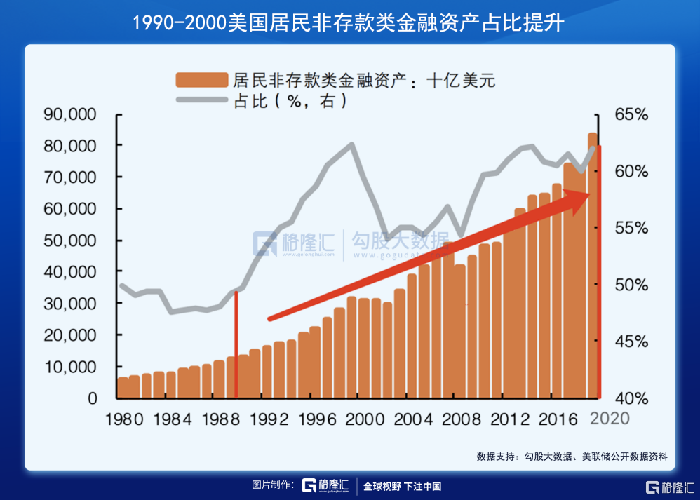 从人民银行统计司发布的《2019年中国城镇居民家庭资产负债情况调查》来看,我国城镇居民家庭资产以实物资产为主(房产是其主要构成部分),约占家庭总资产的八成,金融资产仅占两成左右。对比美国,其居民持有金融资产(产品)比例已超七成,而非存款类金融资产占比超过六成。这一差距也表明,中国居民的实物、金融资产投资结构还有极大的优化空间。