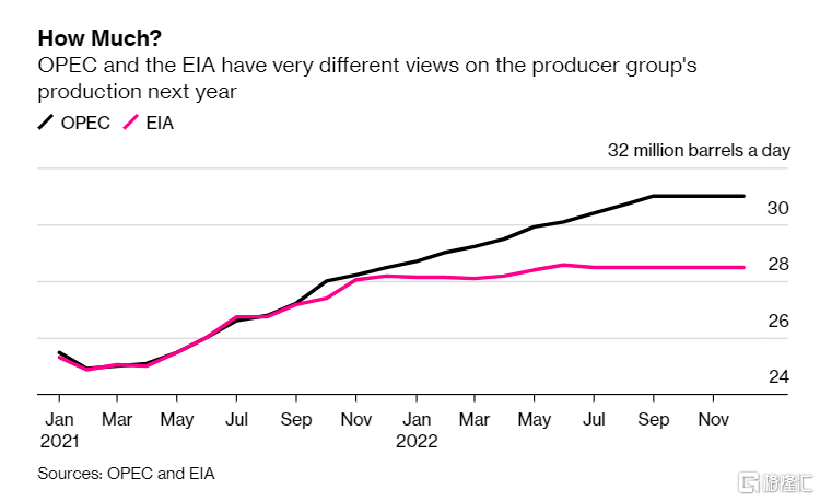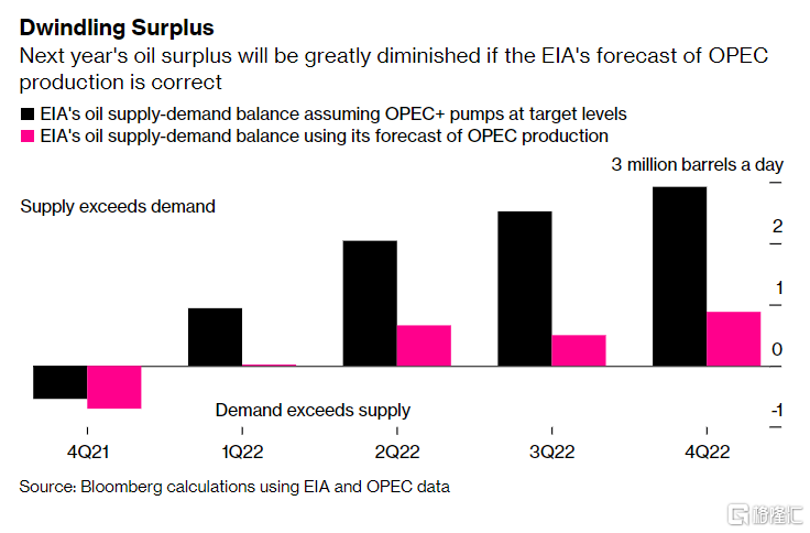 这对明年石油供需平衡的影响是巨大的。根据EIA的需求预测和非OPEC国家的产量预测,以及OPEC+的产量目标,2022年第一季度全球石油供应过剩规模将达到90万桶,并且全年供过于求。但如果按照EIA对OPEC的产量预测来计算,明年油市的供需面就会出现截然不同的情况。