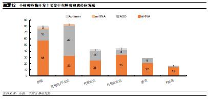 遗传病和肿瘤是在研小核酸药物的主要适应症。小核酸药物的适应症涵盖范围较广,包括肿瘤、罕见病、代谢疾病、自免疫疾病以及感染等,从管线数量来看,目前遗传病和肿瘤是最为热门的开发领域。其中,遗传病多数仍然没有成熟的治疗方案,因此整体竞争格局相对较好,有望为患者带来治疗希望。从不同药物类型来看,目前siRNA药物多数集中在肿瘤领域,而ASO药物多数集中在遗传病领域,这可能是由于siRNA仅能敲低基因表达因此在遗传病中作用受限所致。