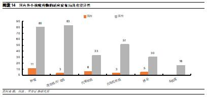 我国小核酸药物行业发展和国外相比差距较大。由于我国小核酸药物开发起步较晚,因此目前获批进入临床试验的项目数量与全球相比差距较大,仅16款产品处于临床阶段,其中多数来自于国外企业,而由中国团队自主开发、进入Ⅱ期的产品数目较少。此外,从产品类型和靶点来看,目前我国小核酸药物开发仍然处于跟随和模仿阶段,多数企业选择的是国外已上市药物的me-too类产品。未来伴随我国小核酸药物开发企业的研发能力提升,有望逐步进入差异化创新和突破型创新阶段。