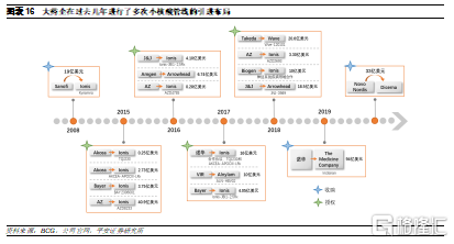 大药企目前主要通过收购或引进等方式布局小核酸领域。回顾小核酸药物发展历史,由于行业一度陷入过低谷期,彼时多家大药企纷纷出售或终止小核酸管线,因此小核酸药物技术进步主要是由这些中小型Biotech公司推动,从而形成了目前的企业竞争格局。而在技术难关被逐步攻破后,为重新进入小核酸赛道,加快管线布局,很多大型药企在过去5年纷纷与这类Biotech公司达成引进和合作开发协议,例如Roche、AZ、J&J和诺华等,行业整体景气度较高。此外,近日诺和诺德宣布将以33亿美元的收购Dicerna公司,未来小核酸行业也将逐步迎来大药企的并购期。