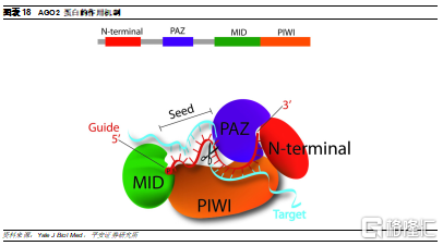 RISC中发挥沉默靶基因作用的主要部分是Argonaute蛋白(AGO2)。为了实现siRNA介导的沉默,AGO2需要连接siRNA反义链,切掉随从链,随后在保持与反义链结合的情况下,经历多个靶mRNA识别、切割和释放循环。AGO2具有三个功能域,PAZ、MID和PIWI,其中PIWI结构域具有RNaseH样的折叠情况,是赋予其切割活性的功能域。PAZ结构域具有RNA结合作用,能够识别单链RNA的3’端,起到了铆定向导链的3’端的作用,5'端则插入MID和PIWI结构域之间,从而便于PIWI结构与实现切割功能。