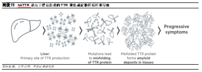 由Alnylam开发的Onpattro于2018年上市,是首个获得美国FDA和欧盟批准的siRNA药物,用于治疗遗传性转甲状腺素蛋白介导淀粉样变性(hATTR)。hATTR是由于TTR基因突变引起,正常情况下,TTR蛋白主要在肝脏中产生,是维生素A的载体。而TTR基因突变会导致其蛋白发生错误折叠,并且聚集成淀粉样原纤维,积聚在多个器官中,从而导致器官和组织损伤,具体症状包括多发性神经病和心肌病,该疾病诊断后的中位生存时间平均为4.7年。此前较为常用的治疗方式包括肝移植、非甾体抗炎药(Difusinal)和小分子药(Tafamidis)。然而,这些药物只作用于稳定TTR蛋白,对于hATTR仅有延长生存时间的效果,因此,科学家试图直接抑制TTR的基因表达。