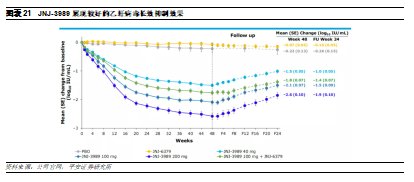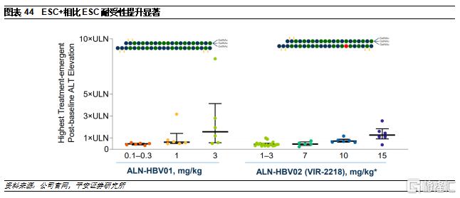 VIR-2218是一款由Vir Biotechnology开发的siRNA药物,其采用了Alnylam的ESC+和GalNAc的递送技术。VIR-2218通过靶向HBV X 基因的一段保守序列,可以沉默所有10种HBV基因型的所有HBV转录本,包括cccDNA和整合DNA,有望实现乙肝功能性治愈。在2021年欧洲肝脏大会上,公司宣布了VIR-2218的临床数据,结果显示,患者在间隔4周注射2次药物后可以在24周内持续性的降低患者体内的HbsAg的水平。该产品与PEG-IFN-α或VIR-3434(一款HBV中和抗体)的联用方案已进入II期临床。
