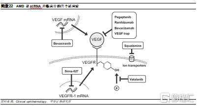 Bevasiranib是全球首个进入临床试验的siRNA药物,由Opko Health开发,是一种21聚体siRNA,用于治疗AMD。AMD的主要发病机制是VEGF介导的脉络膜新血管形成(CNV),因此目前AMD的主要治疗方式是抑制VEGF的血管生成,包括靶向VEGF或其受体,以及抑制VEGF下游功能。Bevasiranib则是通过下调VEGF-A 的mRNA,直接抑制VEGF的表达。而Allergan开发的siRNA药物AGN-745(Sirna-027)则是针对VEGF受体。两款药物均是玻璃体内注射。