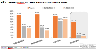 研发成功率较高:由于小核酸药物作用机制明确,通过与mRNA完成Watson–Crick碱基配对来实现其功能,无需契合蛋白质复杂结构,因此研发成功率相对较高。参考Alnylam公司的研发成功率,I期到III期成功率达到59.2%,相比靶向药和整体医药的研发成功率高5倍。