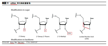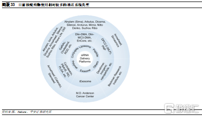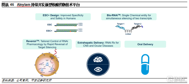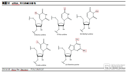 3)ESC+:Alnylam的研发人员发现,RNAi脱靶效应的一个主要原因是与靶mRNA结合的siRNA种子区域部分序列可能具有类似miRNA的功能,可以与其它mRNA的3’非转录区结合,从而导致脱靶。在ESC+平台中,研究人员在siRNA片段中添加了乙二醇核酸(GNA)。GNA具有热不稳定性,因此若只结合种子区域中的部分序列无法发挥沉默作用,降低脱靶概率,进一步提高了RNAi疗法的特异性和安全性。目前已开发出多款在研疗法中已经得到应用并且获得概念验证。