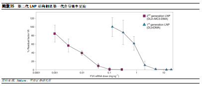 第二代包括DLIN-MC3-DMA,是在第一代的基础上进一步优化,并开发了Patisiran和ALN-PCS等药物。相比第一代,DLin-MC3-DMA具有独特的pH依赖性电荷可变特性:酸性条件下呈正电性,而生理pH条件下呈电中性。其会在内体或溶酶体的酸性环境中质子化,导致H+和cl-离子以及水进入内体,进使得渗透肿胀破裂内体,于是siRNA可以逃离内体/溶酶体,发挥沉默作用。数据显示,在小鼠模型中,第二代相比第一代介导基因沉默的剂量显著降低。