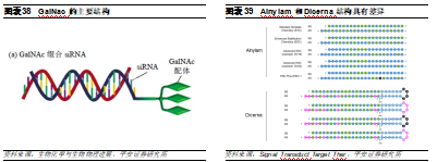 GalNac已经取代LNP。GalNac是目前最常使用的偶联递送系统之一,已有3款基于GalNac偶联递送系统的药物获批上市。GalNAc作为亚洛曲蛋白受体(ASGPR)的配体,是一种特异性高表达于肝细胞膜表面的内分泌受体,几乎没有由其他细胞表达,因此也主要用于肝脏给药。虽然使用范围和脂质分子一样仅限于肝脏,但是其优势显著:1)安全性较好,无需类固醇预处理;2)可以进行皮下给药,患者依从性更好;3)递送效率较高,只需2-5mg/kg剂量即可发挥作用。由于其较为显著的药效和安全性,Alnylam停止了基于LNP递送系统的管线开发,转而使用GalNAc。目前,Alnylam对GalNac的专利覆盖较为全面,涵盖GalNac-siRNA,包括双链核酸结构、限定了一些位点修饰等。Dicerna主要是通过构建单链结构和末尾成环等方式避开专利。