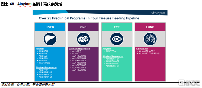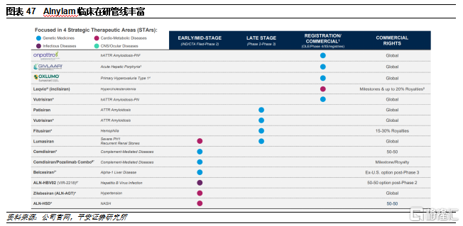 公司具有丰富研发管线。公司目前已有4款RNAi药物完成上市,分别为Onpattro(2018上市,用于治疗遗传性甲状腺素介导的淀粉样变性的多发性神经病)、Givlaari(2019上市,用于治疗急性肝卟啉症)、Oxlumo(2020上市,用于治疗原发性高草酸尿1型)和Leqvio(2020上市,用于降低低密度脂蛋白胆固醇。此外,还有4款产品已进入临床后期阶段,将在未来5年内陆续完成上市,有望持续增厚公司业绩表现。但从适应症来看,公司现阶段的产品多是基于GalNac平台开发,因此主要集中在肝脏相关疾病领域。