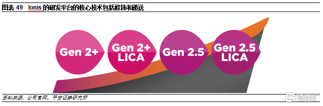 Ionis是ASO领域的领军企业。公司创立于1989年,是ASO药物研究和开发的领头羊。公司的核心技术平台为配体共轭反义技术(Ligand Conjugated Antisense,LICA),其原理是将配体与细胞表面受体特异性偶联,从而将药物递送至目标细胞和组织,例如将GalNac偶联至ASO药物。除了LICA技术外,公司还有2个核心修饰技术,共同推动新一代ASO药物开发: