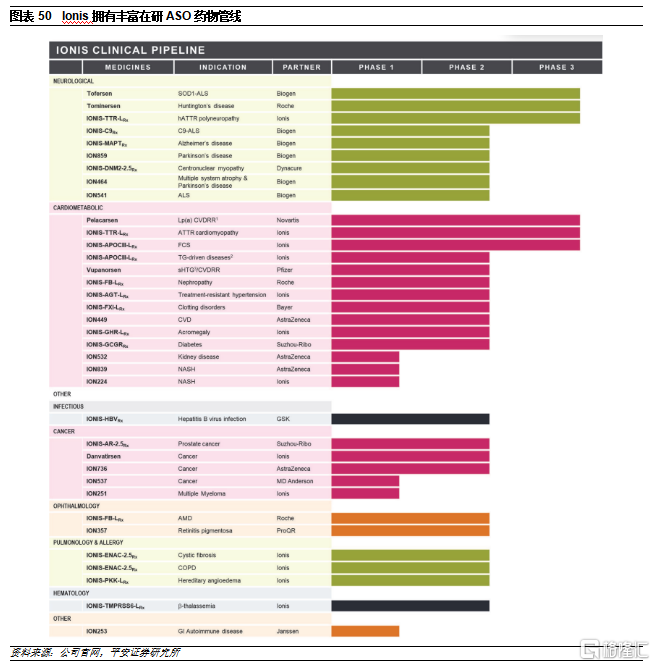 公司拥有小核酸领域的首个爆款产品,研发管线丰富。基于研发平台,公司建立了丰富的研发管线,目前已有三款ASO药物获批上市,分别为Tegsedi(2018年上市,用于治疗遗传性转甲状腺素蛋白淀粉样变性患者的多发性神经病)、Spinraza(2019年上市,用于治疗脊髓性肌萎缩症)、waylivra(2019年上市,用于治疗家族性乳糜微粒血症综合征),其中,Spinraza在2019年的收入已经超过20亿美元,成为RNAi治疗重磅药物。此外,公司还有超过三十多个在研品种,适应症覆盖心血管、代谢、神经、呼吸系统、眼科、癌症、传染病等领域。