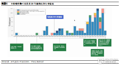 核酸药物处境可类比20年前的抗体行业。从2016年起, 小核酸药物每年约有2款产品获批上市,占FDA每年批准药物总数的5%左右,与20年前的抗体药物行业处境相似:在1986年首款抗体药物上市后,到1994年才有第二款单抗药物上市,随后又经历了几年空歇,才进入平均每年获批2款产品的阶段,直到2014年才进入快速发展期。小核酸药物和单抗类似,均属于技术驱动型行业,存在较高的开发壁垒,未来随着技术难关被逐个攻破,小核酸药物也有望进入全面发展阶段。