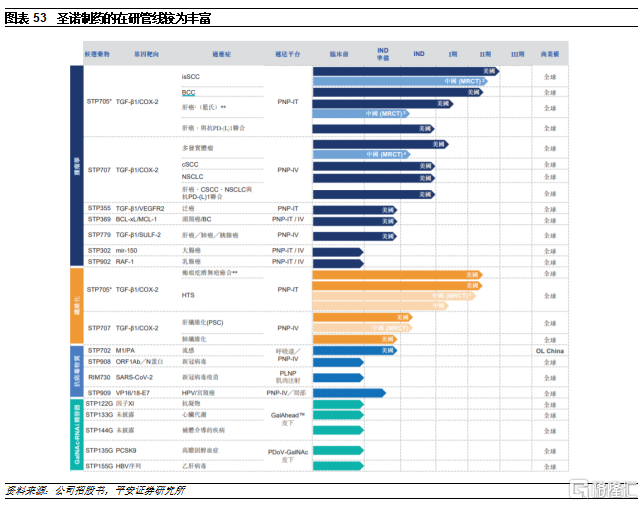 进展最快的STP705已经获得积极II期数据。STP705是公司通过PNP将两种靶向TGF-β1和COX-2 mRNA的siRNA组合而成,有望协同促进肿瘤抑制并下调参与纤维化作用的基因表达。STP705目前已开展多项临床试验,包括胆管癌、肝细胞癌、非黑色素瘤皮肤癌和增生瘢痕治疗等,其中,用于治疗胆管癌、肝细胞癌和原发硬化性胆管炎的临床指症已经获得了美国FDA的“孤儿药”认证。STP705在成年患者中治疗鳞状细胞皮肤癌(isSCC)的2a期研究显示了积极的疗效和安全性结果,患者中有76%(19/25)在治疗后病灶内肿瘤细胞组织学彻底清除。两个最佳剂量组中达到了90%(9/10)的患者到达肿瘤细胞的组织学彻底清除。该研究没有出现任何重大或严重的不良事件,包括没有明显的皮肤反应,公司得以在后阶段研究中提前明确治疗窗口。