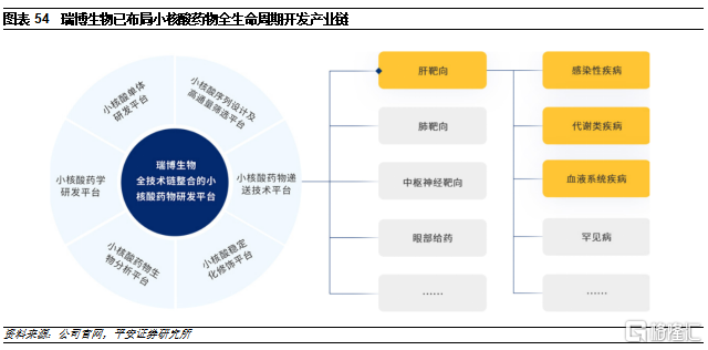 瑞博生物逐步完善小核酸药物全产业链布局。公司成立于2007年,是国内最早成立的小核酸制药企业之一,拥有丰富的小核酸药物行业经验和技术知识,建立了包括小核酸序列设计及高通量筛选、小核酸药物递送技术、小核酸稳定化修饰、小核酸药物生物分析、小核酸药学研究、小核酸单体研发等在内的自主可控、全技术链整合的六大核心技术平台,可支持小核酸药物从早期研发到产业化的全生命周期。