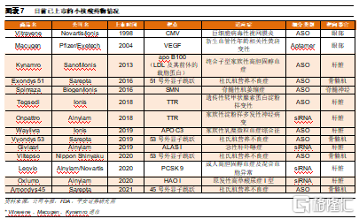 我国小核酸药物市场仍然处于发展初期。与全球相比,我国小核酸药物的开发起步较晚,第一家小核酸药物研发企业的成立时间相比Ionis晚10年,首款siRNA药物的临床获批时间相比全球晚了11年。因此目前国内的小核酸行业仍然处于发展初期阶段,仅一款产品获批上市,为Ionis 的Spinraza。但由于国内患者群体基数较大、需求较多,因此未来伴随小核酸药物开发的持续推进,以及国内企业的技术逐步成熟,我国小核酸药物市场有望迎来快速发展。
