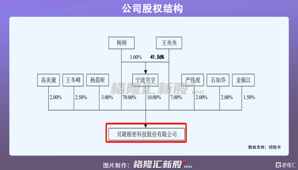 IPO前,杨炯和王央央夫妻为贝隆精密实际控制人。其中,杨炯通过直接持股或间接控制宁波贝宁共持股80%,王央央持股7%,夫妻二人合计共控制公司87%的股份。贝隆精密是典型的“夫妻店”模式。