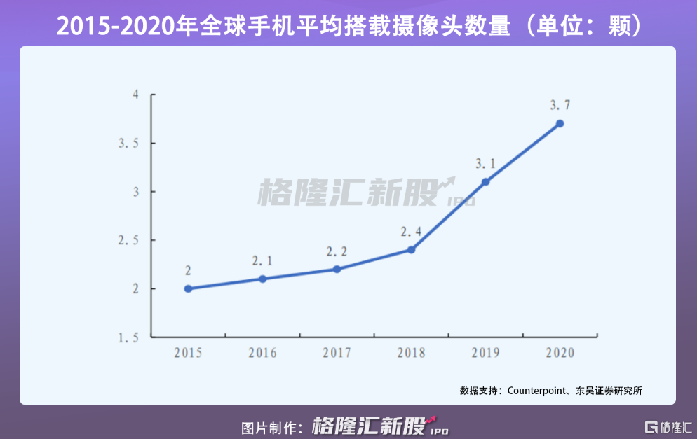 聚焦到贝隆精密下游主要应用领域智能手机来看,受益于全球智能手机出货量增加,以及终端消费者愈加关注手机拍摄功能,推动多摄方案渐成行业趋势,单部手机上所搭载的摄像头数量呈现稳健增长态势。2015年至2020年,全球智能手机单机搭载摄像头的平均数量从 2颗增至3.7 颗。按手机镜头出货量计,预期将从2020年45.55亿颗增加至2021年的50.70 亿颗,同比增长 11%。