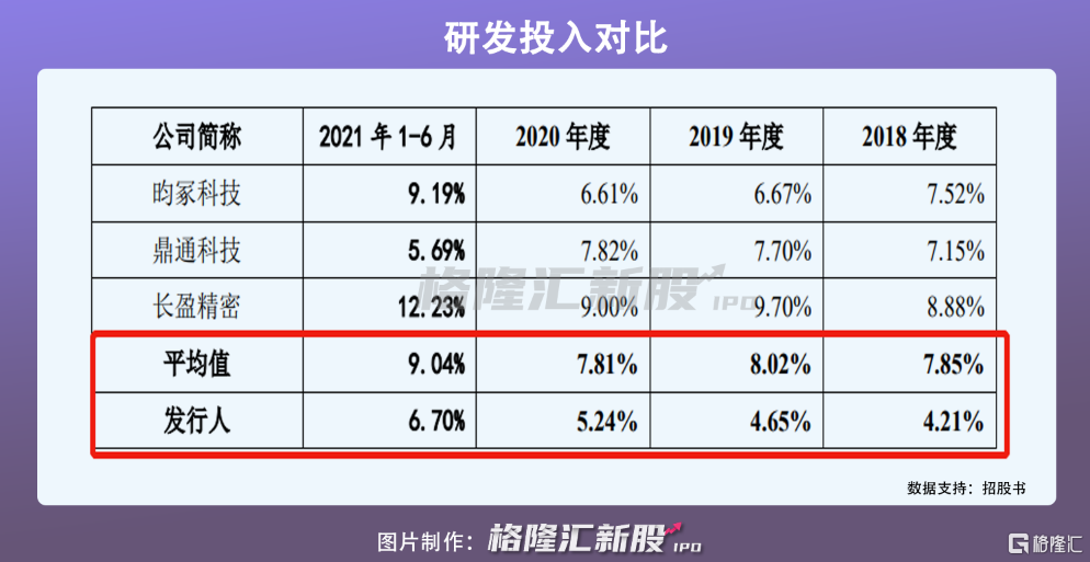 报吿期内,公司在加大研发费用投入,2018年至2021年上半年,费用投入金额分别为678万元、1145万元、1325万元、833万元,同期研发费用投入占总营收比重逐年攀升,分别为4.21%、4.65%、5.24%、6.70% 。但由于其低于行业平均值,随着红海竞争显现,贝隆精密或因研发投入不足,致使业务开展乏力。