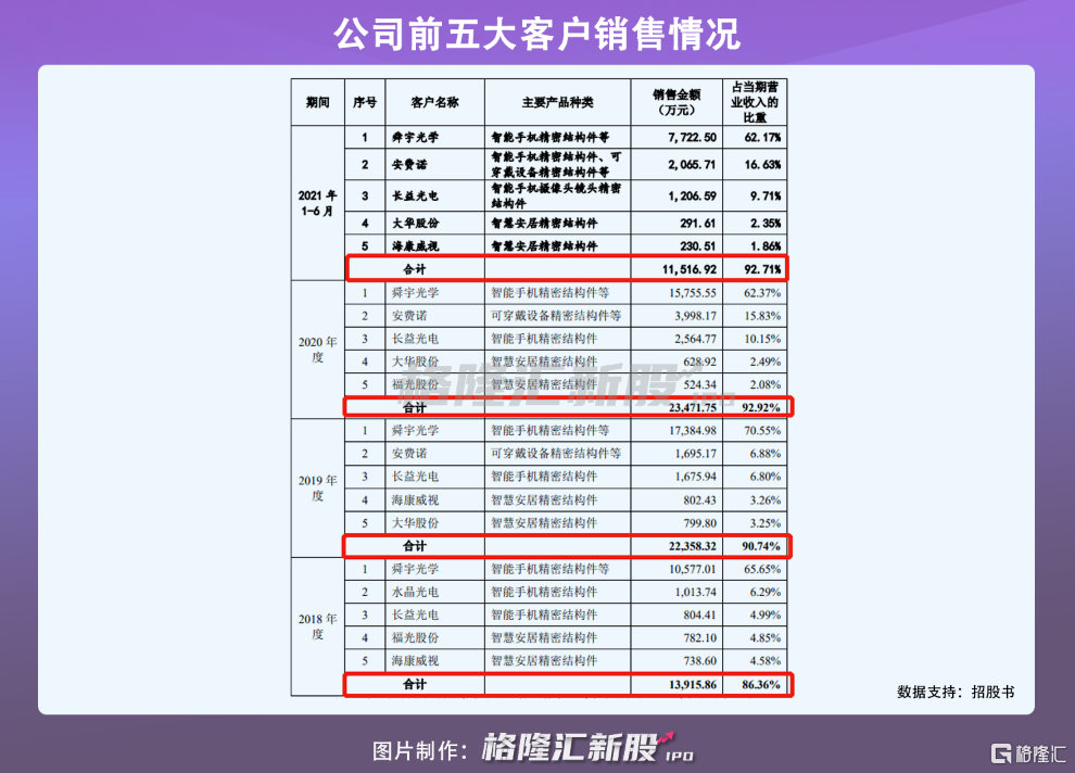 贝隆精密主要客户是舜宇光学、安费诺、海康威视、大华股份等相关行业内龙头企业。报吿期内,其向前五大销售客户销售收入占到了当期营收八成以上,且从2018年的86.36%上升至92.71%,公司客户集中度较高。其中,贝隆精密的第一大客户舜宇光学贡献的销售收入占营收比重保持在62%以上,公司收益对舜宇光学形成依赖。未来如果其不能维持与主要客户合作关系,或者主要客户因行业竞争加剧等影响,导致市场份额下降,继而下调公司产品采购价格,或减少了对公司的产品采购,贝隆精密的营收或将下滑。