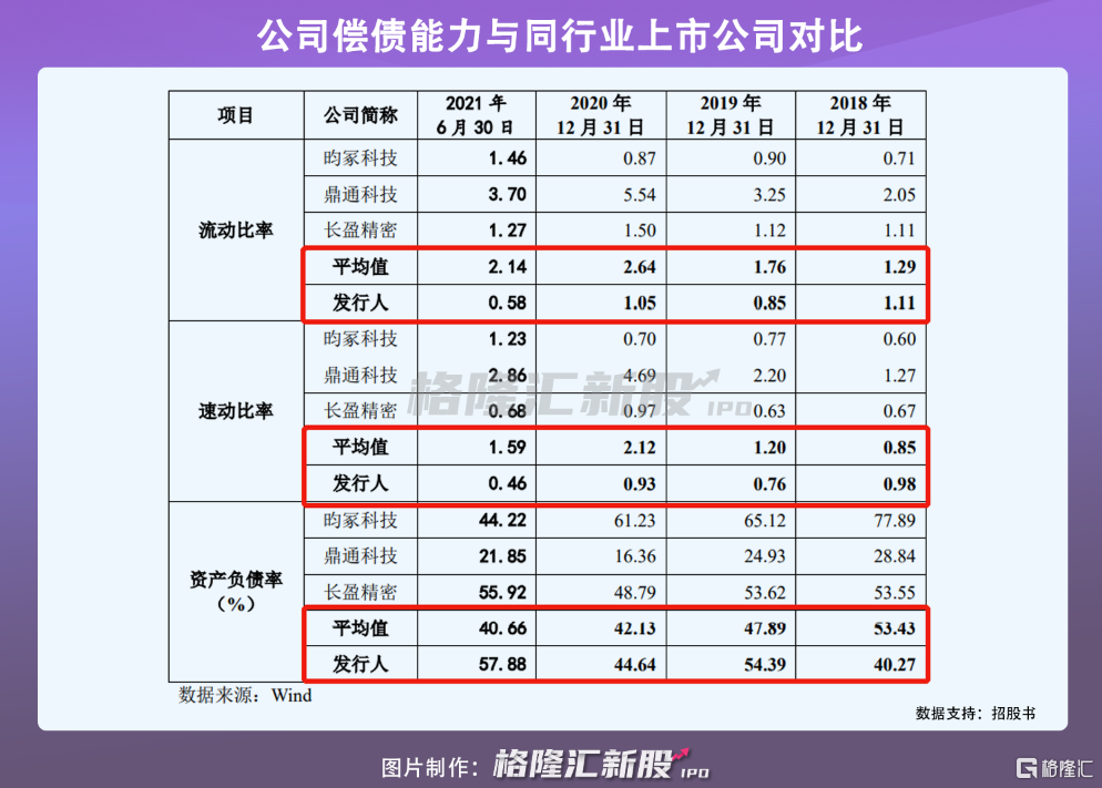 此外,由于贝隆精密资产负债率呈现波动上升态势,从2018年的40.27%增至2021年上半年的57.88%。其中,自2019年开始,其资产负债率高于同行业上市公司平均值,公司短期借款占比大。需要指出的是,报吿期内,公司的流动比率和速动比率波动下滑。截至今年上半年,流动比率仅为0.58倍,低于行业均值为2.14倍;与此同时,速动比率从2018年的0.98大幅下降2021年上半年0.46,且同样低于行业均值。贝隆精密资金回笼速度减慢,面临短期偿债压力。