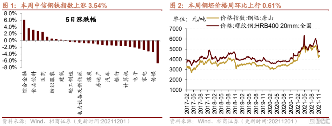 本周在供给受限、需求边际改善的催化下,钢铁建筑领域景气度有所回升。从5日涨幅来看,中信钢铁板块5日上涨3.54%,在中信一级行业中居于领先水平。价格方面,截至12月1日,钢坯价格4310.00元/吨,周环比上行0.61%;截至11月30日,铁矿石价格指数为377.42,周环比上行6.60%。