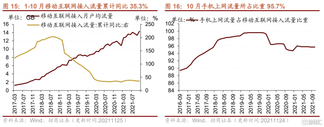 10月移动互联网接入月户均流量上升。10月移动互联网接入月户均流量为14663.68MB,月同比上升24.96%,环比增长7.19%;1-10月移动互联网接入流量累计值为1810亿GB,累计同比上升35.28%,较上月增幅缩小0.5个百分点。手机上网流量占移动互联网接入流量比重为95.7%,与上月持平。