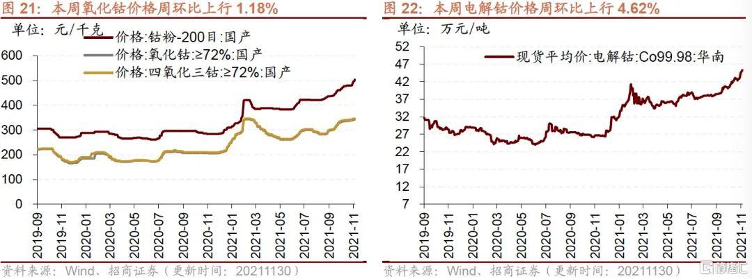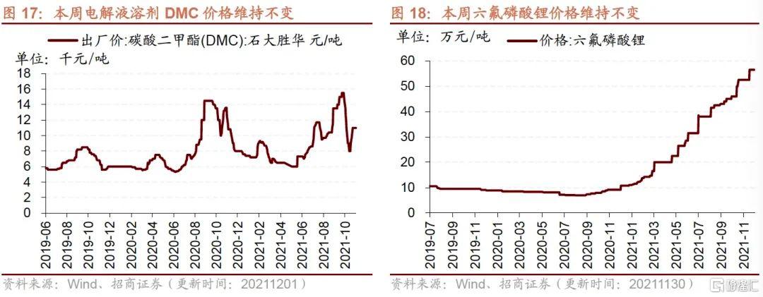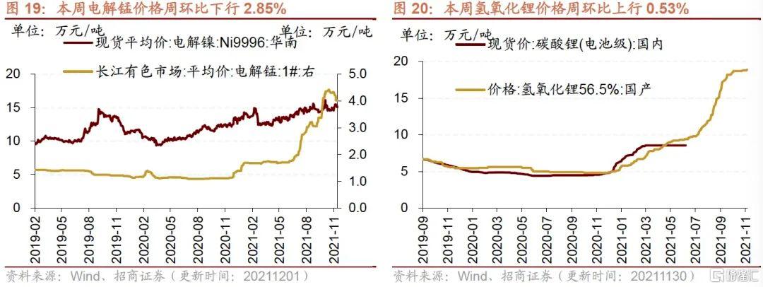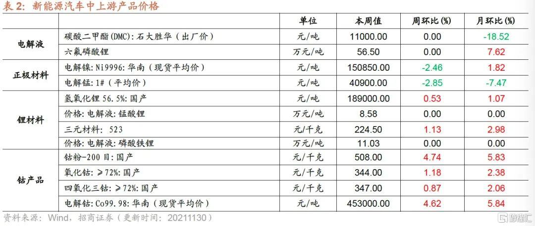 本周氢氧化锂、三元材料和钴材料价格上行,电解液和部分锂材料价格维持不变,正极材料价格下行。在电解液方面,截至12月1日,电解液溶剂DMC价格维持在11000元/吨;截至11月30日,六氟磷酸锂价格维持在56.5万元/吨。在正极材料方面,截至12月1日,电解镍Ni9996现货均价周环比下行2.46%至150850元/吨;电解锰市场平均价格周环比下行2.85%至40900元/吨。在锂原材料方面,截至11月30日,电解液锰酸锂价格维持在8.58万元/吨;电解液磷酸铁锂价格维持在11.03万元/吨;截至12月1日,氢氧化锂价格周环比上行0.53%至189000元/吨;三元材料价格周环比上行1.13%至224.5元/千克;钴产品中,截至12月1日,电解钴价格周环比上行4.62%至453000.0元/吨;钴粉价格周环比上行4.74%至508.0元/千克;氧化钴价格周环比上行1.18%至344元/千克;四氧化三钴价格周环比上行0.87%至347元/千克。