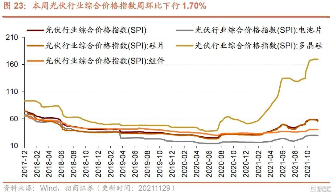 本周光伏行业综合价格指数下行,组件、硅片、电池片价格指数下行,多晶硅价格指数不变。截至11月29日,光伏行业综合价格指数为57.33,较11月22日下降1.70%;硅片价格指数为54.99,较11月22日下降4.86%;组件价格指数为39.89,较11月22日下降0.23%;电池片价格指数为29.03,较11月22日下降1.59%;多晶硅价格指数为169.66,与上周持平。