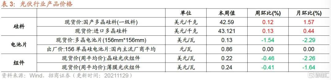 本周光伏产业链中硅料价格上行、电池片、组件价格均下行。在硅料方面,截至11月29日,国产多晶硅料价格为42.59美元/千克,较上周上升0.12%;进口多晶硅料价格为43.21美元/千克,较上周上升0.13%。在电池片方面,截至11月29日,156多晶电池片现货价为0.13美元/瓦,较上周下降1.54%。在组件方面,截止11月24日,晶硅光伏组件的价格周环比下降0.46%至0.22美元/瓦;薄膜光伏组件的价格周环比下降0.41%至0.24美元/瓦。