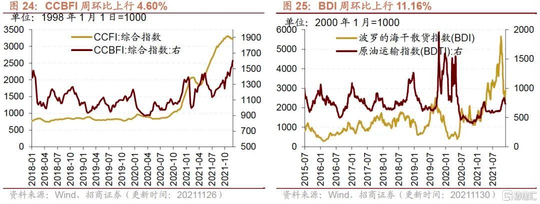 本周中国出口集装箱运价指数CCFI下行,中国沿海散货运价综合指数CCBFI上行。在国内航运方面,截至11月26日,中国出口集装箱运价综合指数CCFI周环比下行1.41%至3199.98点;中国沿海散货运价综合指数CCBFI周环比上行4.60%至1602.46点。本周波罗的海干散货指数BDI上行,原油运输指数BDTI下行。在国际航运方面,截至11月30日,波罗的海干散货指数BDI为3018点,较上周上行11.16%;原油运输指数BDTI为721点,较上周下行4.25%。