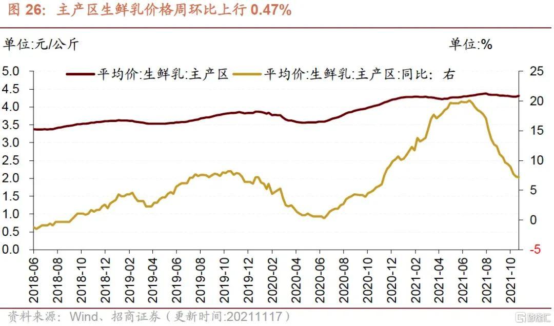 主产区生鲜乳价格上行。截至11月17日,主产区生鲜乳价格报4.31元/公斤,周环比上行0.47%,较去年同期上涨6.68%。