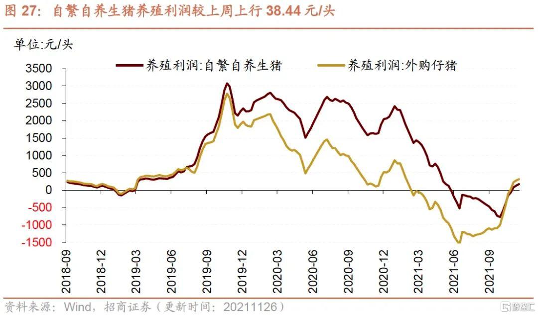 在生猪养殖利润方面,本周自繁自养生猪养殖利润扩大,外购仔猪的养殖利润继续上行。截至11月26日,自繁自养生猪养殖利润为173.76元/头,较上周上行38.44元/头;外购仔猪养殖利润为320.40元/头,较上周上行37.59元/头。