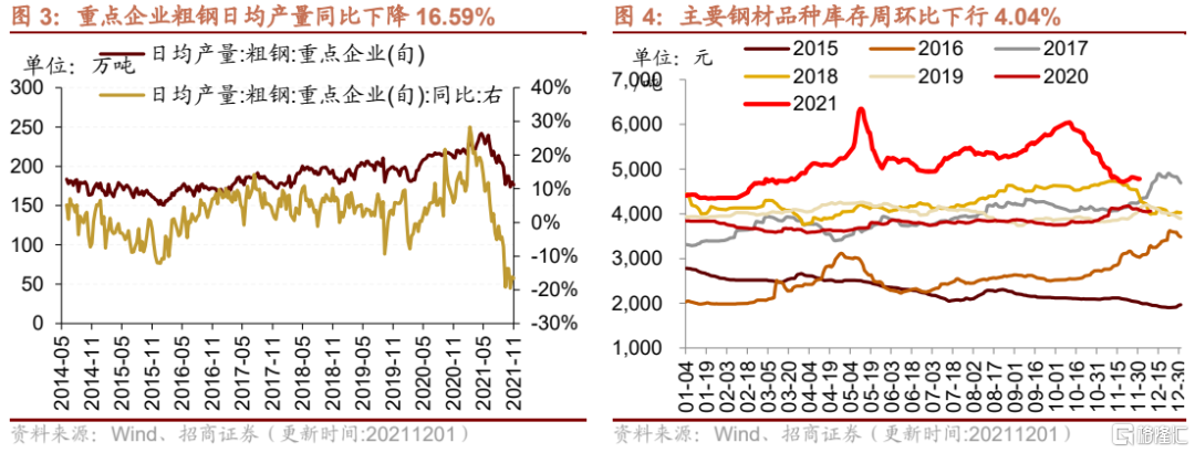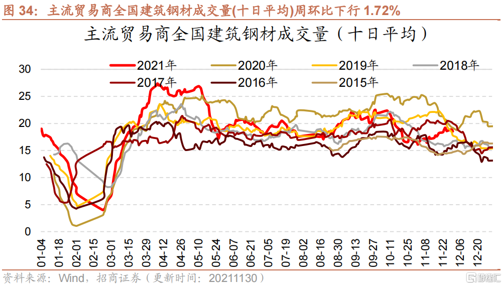 供给端来看,前期在双碳、限产等政策背景的约束下,粗钢产量受到抑制;近期北方陆续开始供暖,季度限产逐步推进,钢材供应边际下降。截至11月20日,重点企业粗钢日均产量为176.28万吨/天,旬环比下行2.04%,同比下降16.59%;全国粗钢预估日均产量为223.82万吨/天,旬环比下行4.46%,同比下降25.51%。