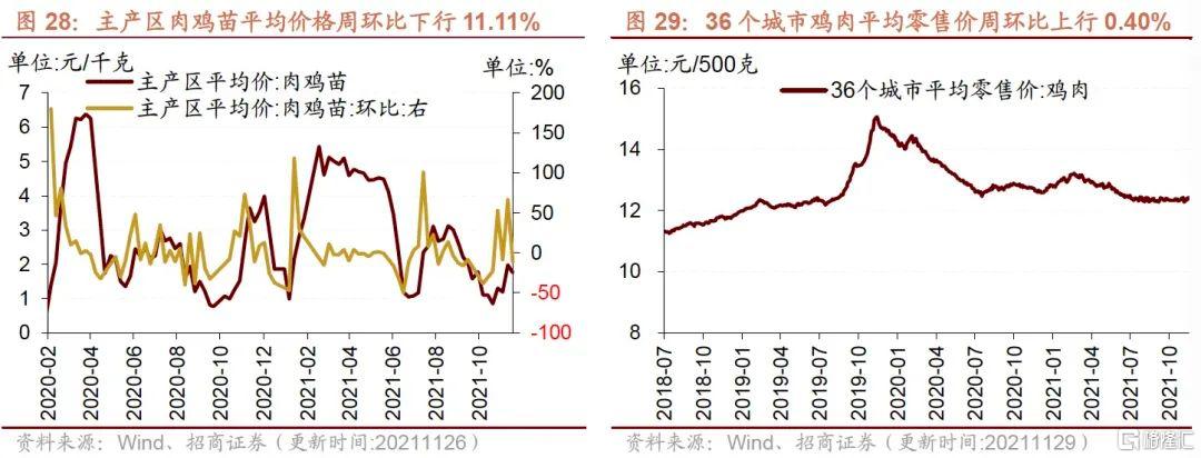 在肉鸡养殖方面,肉鸡苗价格下行,鸡肉价格上行。截至11月26日,主产区肉鸡苗平均价格为1.76元/羽,较上周下行11.11%;截至11月29日,36个城市平均鸡肉零售价格为12.45元/500克,周环比上行0.40%。