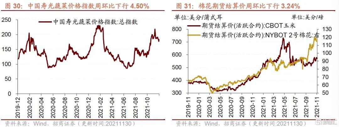 蔬菜价格指数下行,棉花期货结算价下行,玉米期货结算价下行。截至11月30日,中国寿光蔬菜价格指数为183.04,周环比下行4.50%;截至11月30日,棉花期货结算价格为111.41美分/磅,较上周下行3.24%;玉米期货结算价格为567.50美分/蒲式耳,周环比下行3.53%。
