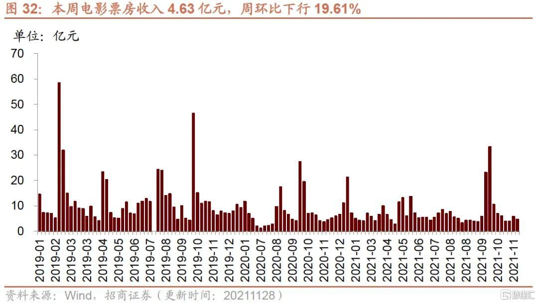 本周电影票房收入、观影人数周环比下行。截至11月28日,本周电影票房收入4.63亿元,周环比下行19.61%;观影人数1274.48万人,周环比下行19.53%;电影上映223.13万场,周环比上行7.72%。