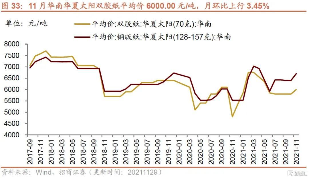 11月华南华夏太阳双胶纸、铜版纸平均价月环比上行。11月华南华夏太阳双胶纸平均价6000.00元/吨,月环比上行3.45%,同比上行25.00%;华南华夏太阳铜版纸平均价6700.00元/吨,月环比上行4.69%,同比上行21.27%。