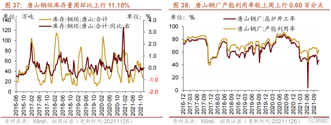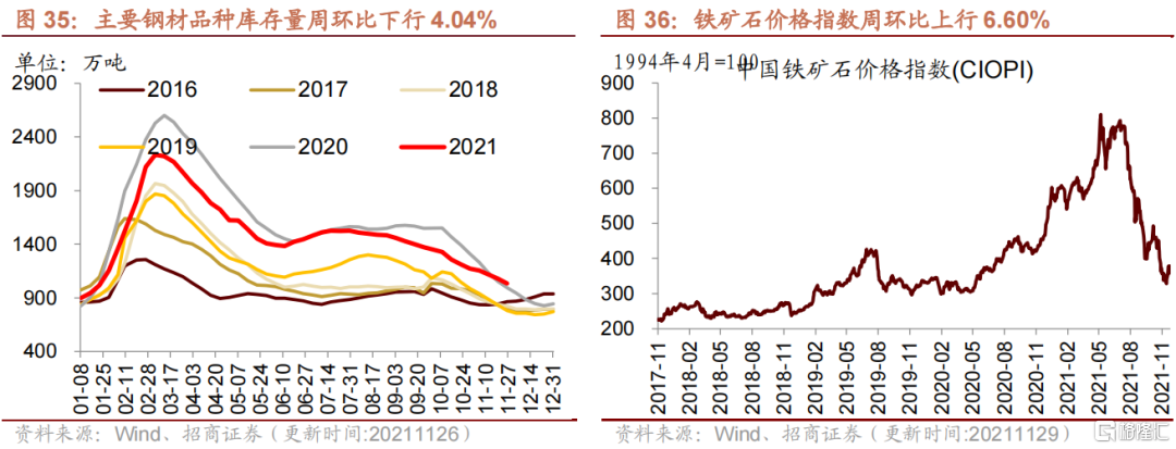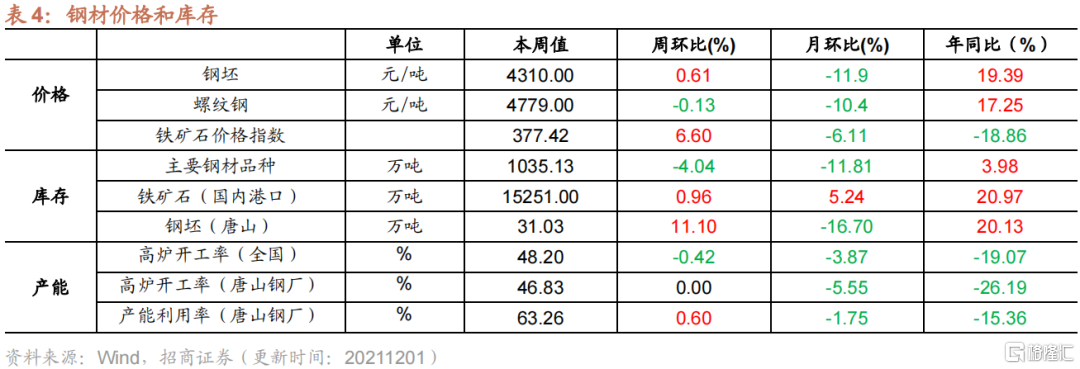 库存方面,截至11月25日,国内港口铁矿石库存量为15251.00 万吨,周环比上行0.96%;唐山钢坯库存量为31.03万吨,周环比上行11.10%;截至11月26日,主要钢材品种库存周环比下行4.04%至1035.13万吨。粗钢产能目前仍处于较低水平,截止11月26日,全国高炉开工率48.20%,较上周下行0.42个百分点;唐山钢厂高炉开工率46.83%,与上周持平;唐山钢厂产能利用率63.26%,较上周上行0.60个百分点。需求端来看,房地产政策出现边际放松预期,提振板块信心。