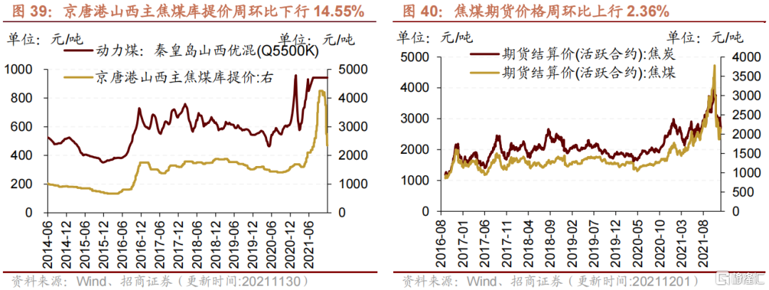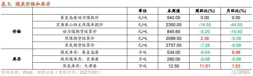 价格方面,秦皇岛港动力煤报价周环比保持不变,京唐港山西主焦煤库提价周环比下行;焦煤期货结算价上行,焦炭、动力煤期货结算价下行。截至11月30日,秦皇岛港动力煤报价942.00元/吨,与上周持平;京唐港山西主焦煤库提价2350.00元/吨,周环比下行14.55%。截至12月1日,焦炭期货结算价收于2757.50元/吨,周环比下行7.28%;焦煤期货结算价收于2099.50元/吨,周环比上行2.36%;动力煤期货结算价845.60元/吨,周环比下行5.20%。
